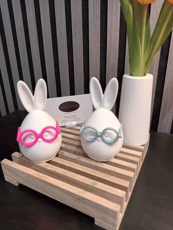 Der Osterhase mit Brille ist aus Keramikpulver gegossen und geschliffen. Die Brille ist aus Kunststoff . Durch die Produktion können Luftblasen und Unebenheiten entstehen.