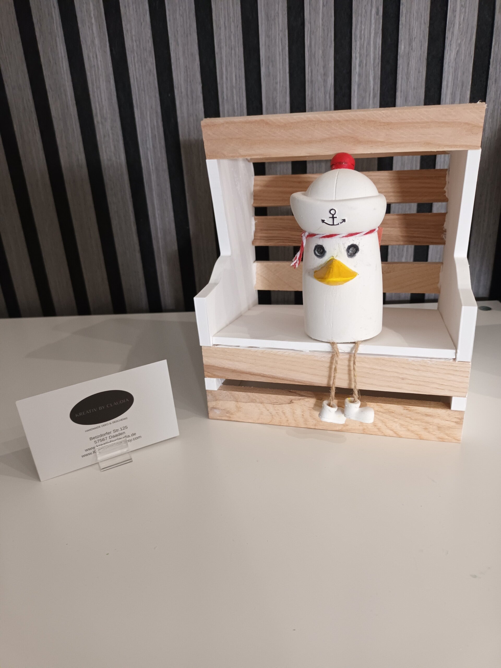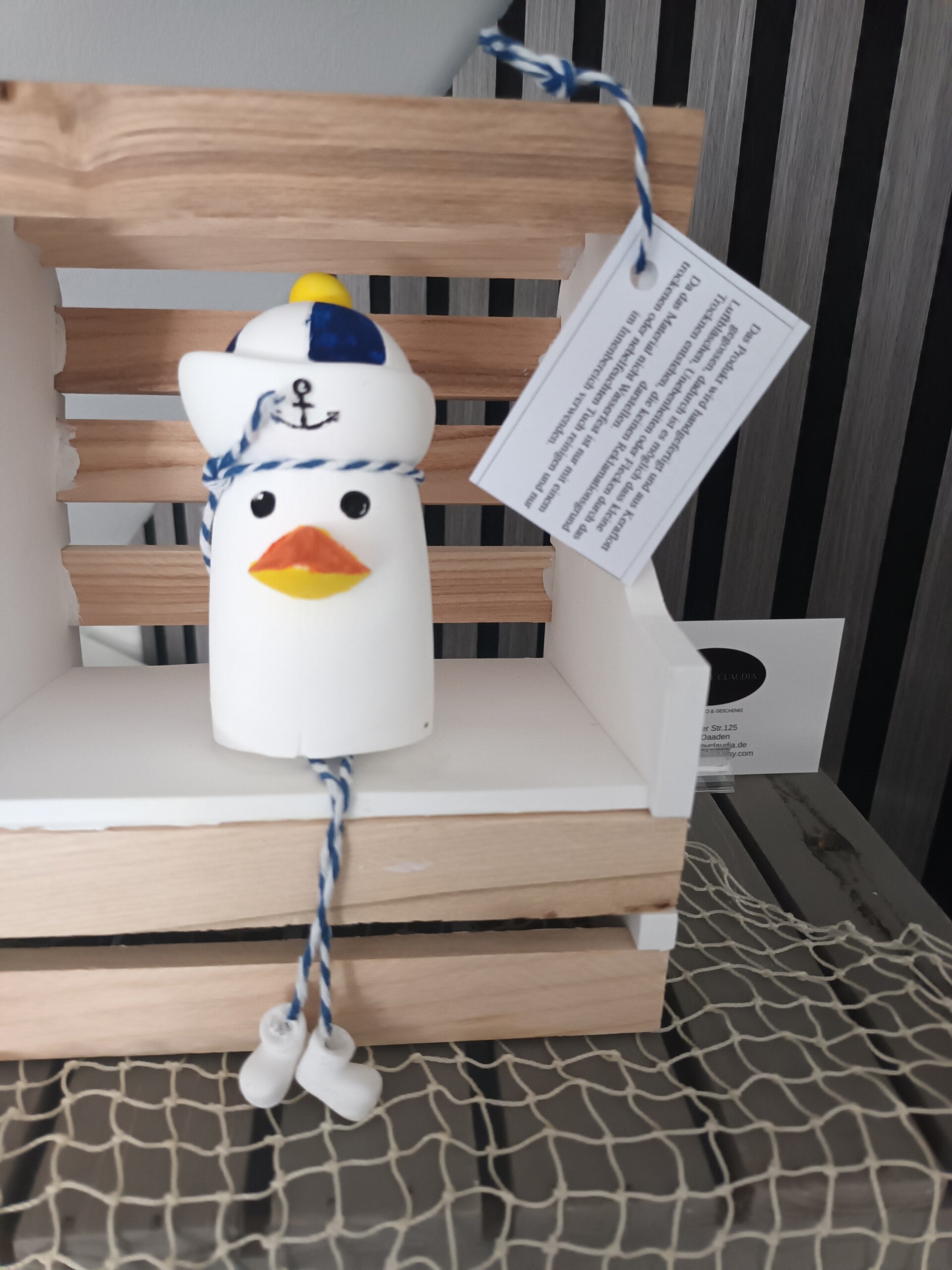 Die Möwe Kai-Uwe ist aus Keramikpulver gegossen und bemalt .Die Füsse sind mit einer Schnur dran geklebt .