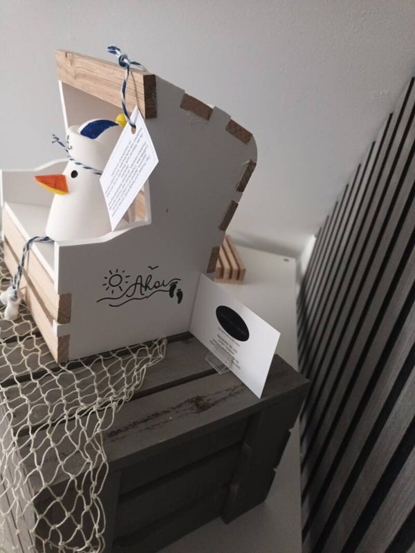 Der Strandkorb ist aus Keramikpulver gegossen, geschliffen und geklebt.Das Holz ist aus Esche unbehandelt und auch geklebt .
